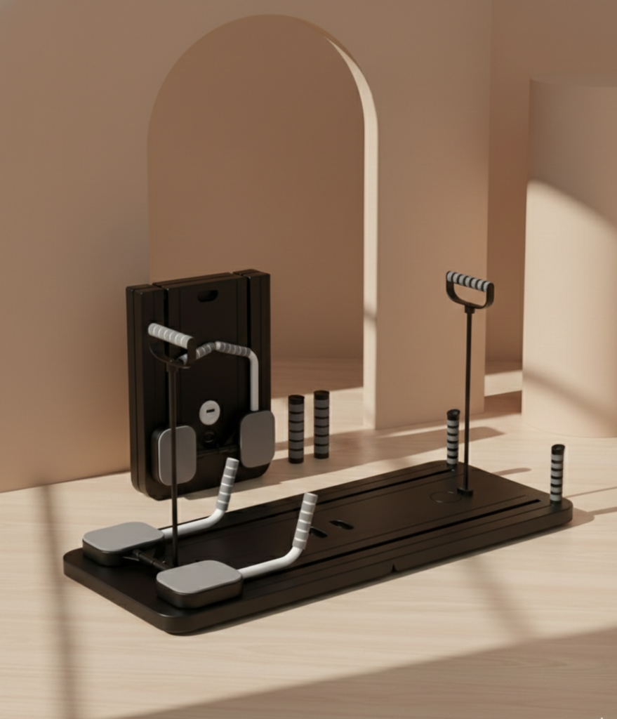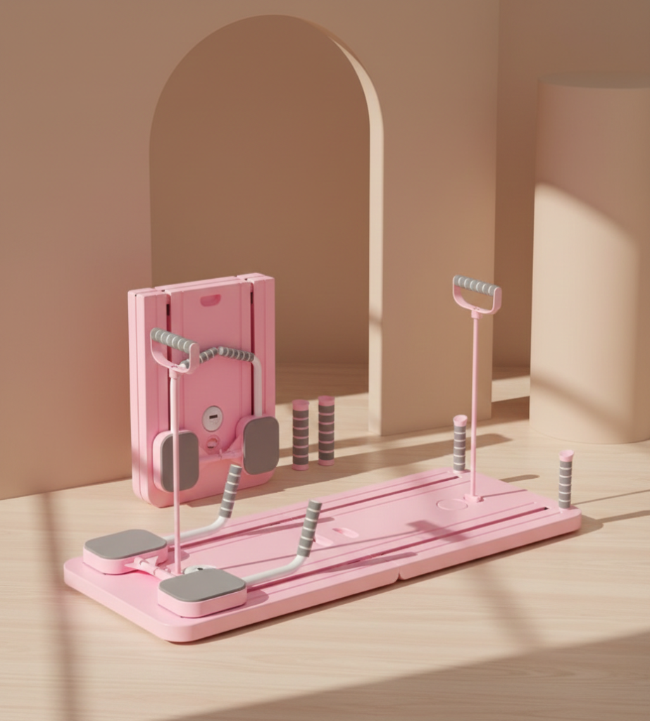 JANUA Pilates Reformer Board – 5-in-1 Foldable Sliding System Pink – Add a splash of color to your movement with this stunning ‘Soft Pink’ all-in-one Pilates system.